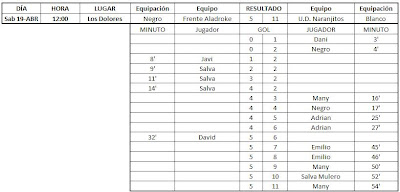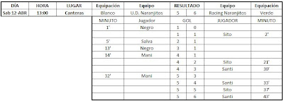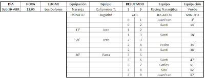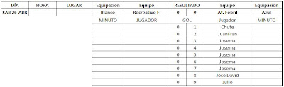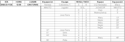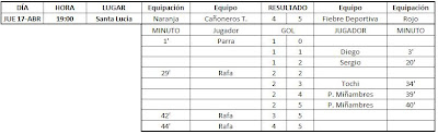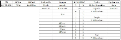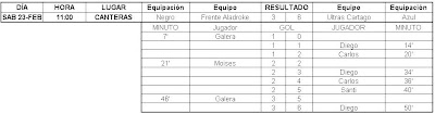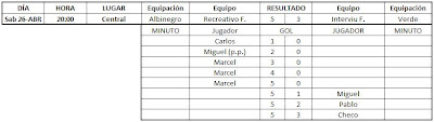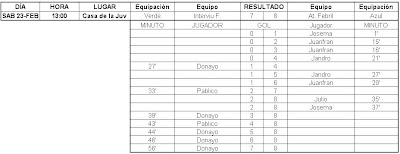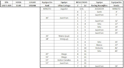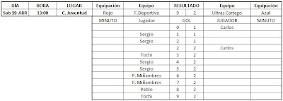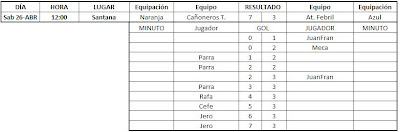 Por fin he tenido un poco de tiempo para actualizar esto, aquí tenéis los resultados de las últimas jornadas, falta el partido que gano 5-0 el At. Febril a los Ultras Cartago por incomparecencia de estos últimos.